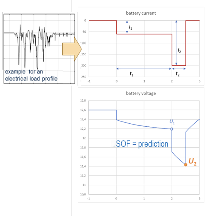The state-of-function (SOF) concept can be very powerful for battery monitoring, too. Where the vehicle relies on power performance of the battery, the signal definition of the intelligent battery sensor (IBS) or other battery monitoring system (BMS) should be defined as SOF, too. This will enable systematic verification and allow appropriate algorithm solutions for instantaneous prediction (e.g., short-term observers) that may be insensitive against inaccuracies of state of charge (SOC), remaining capacity, etc. As will be shown in the following section, SOF of a freshly charged battery is only loosely correlated with its absolute SOC, for example. Unlike this sizing tool, an online in-vehicle SOF prediction would have to factor in this transient boost of pulse-discharge performance in order to maximize availability of vehicle functions.
